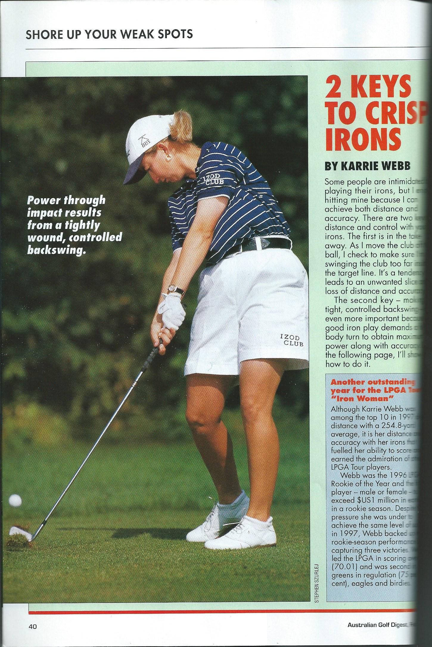 Demonstrated by Karrie Webb who was the first player – male or female – to exceed US$1 million in earnings in a rookie season, there are 2 main keys to crisp irons: