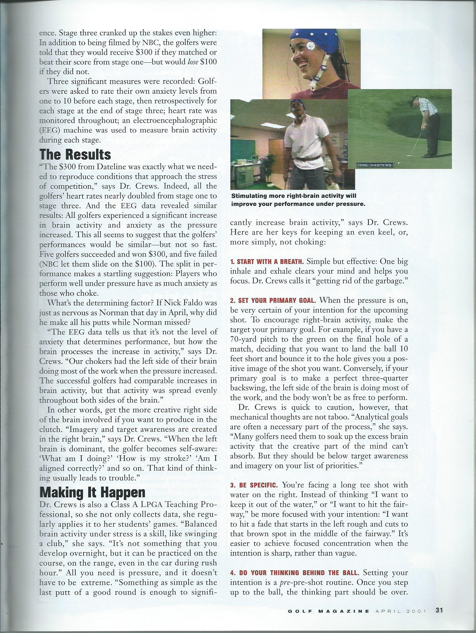 The results of the study showed the all golfers experienced a significant increase in brain activity and anxiety as the pressure increased. However, the determining factor is that its not the level of anxiety that determines performance, but how the brain processes the increase in activity. The successful golfers had comparable increases in brain activity, but that activity was spread evenly throughout both sides of the brain.