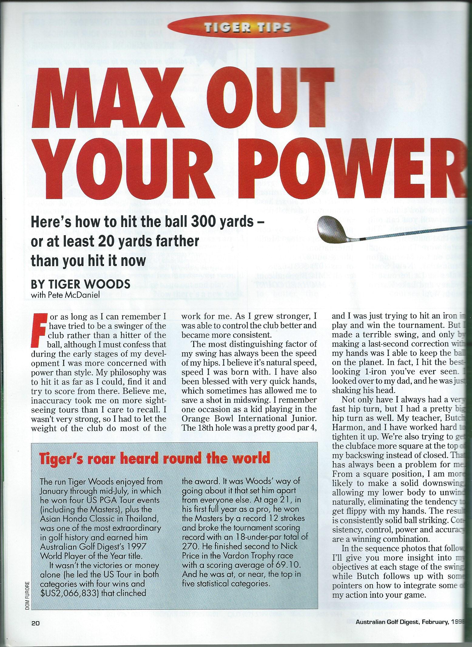 The next several postings will be based on a lengthy (9 page) article on Tiger Woods taken from the February 1998 issue of Australian Golf Digest and written by the great golfer himself with Pete McDaniel.